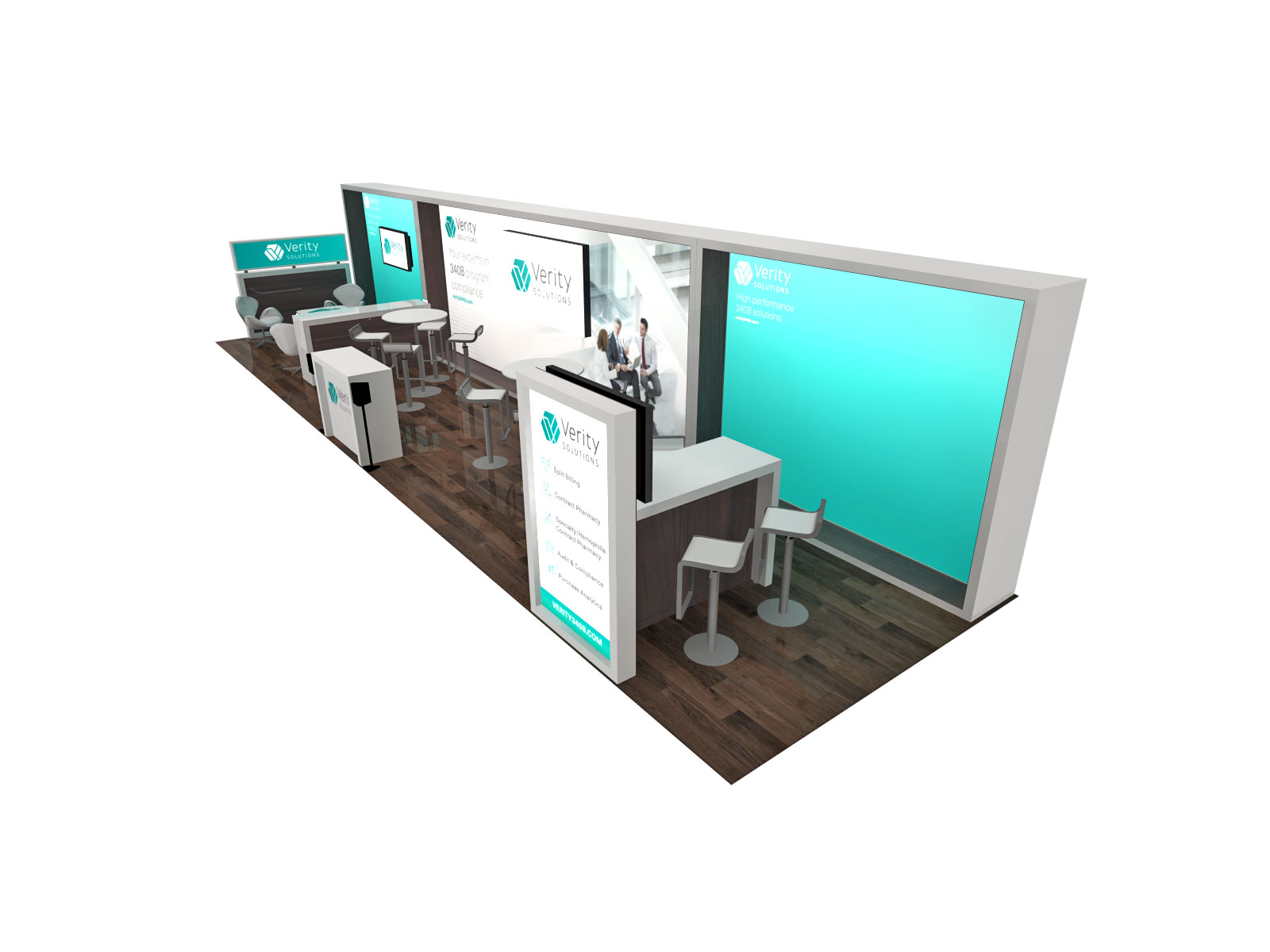 Many exhibits are re-configurable to smaller inlines or larger islands. Want to see this trade show display with your branding? No problem. Give us a call or send us an email.